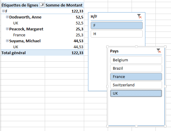 Supposons maintenant que vous souhaitiez afficher les données concernant les femmes vivant en France ou au Royaume-Uni. Sous H/F, cliquez sur F. Sous Pays, cliquez sur France, maintenez la touche Ctrl enfoncée et cliquez sur UK. Le tableau croisé dynamique est mis à jour en conséquence.