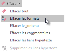 Sélectionnez la cellule ou la plage de cellules dont vous voulez supprimer la mise en forme. Sélectionnez l'onglet Accueil dans le ruban, cliquez sur l'icône Effacer dans le groupe Édition, puis sélectionnez Effacer les formats dans le menu.