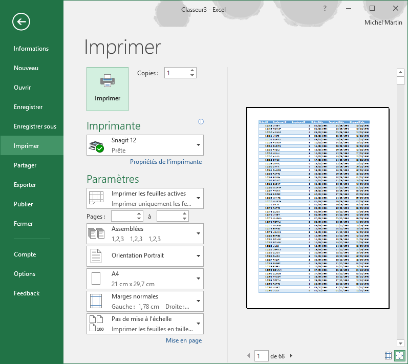 Pour afficher un aperçu avant impression d’une feuille de calcul, basculez sur l’onglet Fichier du ruban et cliquez sur Imprimer. L’aperçu est affiché dans la partie droite de la vue Backstage.