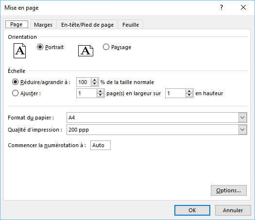 Les paramètres complémentaires sont regroupés sous plusieurs onglets. Vous pouvez par exemple modifier les marges de la feuille ou encore définir un en-tête et/ou un pied de page. Effectuez les réglages nécessaires, cliquez sur OK, puis sur Imprimer pour lancer l’impression.