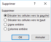 Cliquez sur la flèche située sous l'icône Supprimer et sélectionnez Supprimer les cellules dans le menu. Choisissez une option dans la boîte de dialogue Supprimer, puis cliquez sur OK. Ici, les cellules sont décalées vers la gauche.