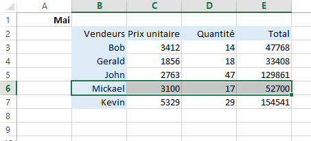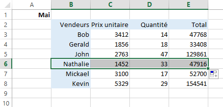 Dans cet exemple, nous allons supposer que la ligne représentant les ventes de Nathalie pour le mois de Mai a été oubliée.