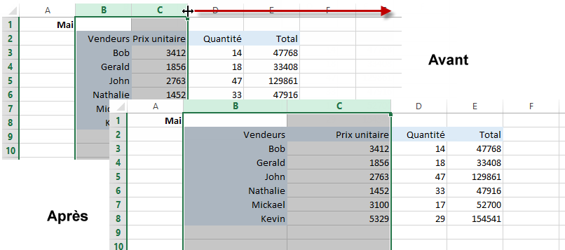 Notez également qu'il est possible d'ajuster automatiquement la largeur d'une colonne à son contenu. Positionnez le pointeur dans la bordure droite de l'en-tête de la colonne à redimensionner et doublecliquez. La largeur de la colonne s'adapte automatiquement à son contenu.