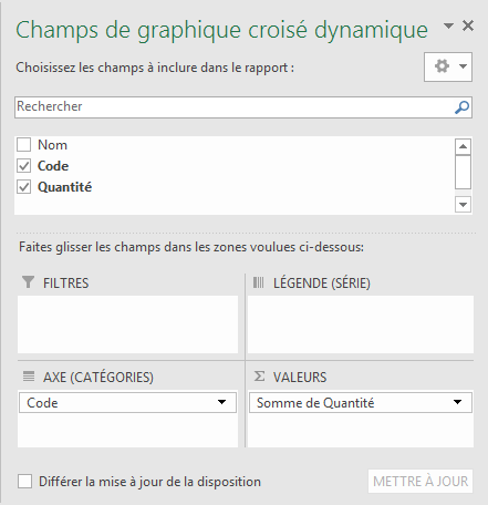 Selon le graphique choisi, un volet peut apparaître sur le côté droit de la fenêtre. Ici, par exemple, le volet Champs de graphique croisé dynamique permet de personnaliser le tableau croisé dynamique utilisé pour réaliser le graphique.