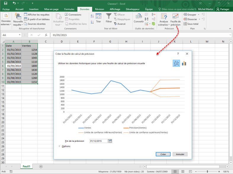 A titre d’exemple, nous allons utiliser des données qui représentent les chiffres de vente mensuels d’une société, entre les mois de Janvier et de Septembre 2015. Pour obtenir les prévisions pour les mois à venir, cliquez sur une cellule de données, basculez sur l’onglet Données dans le ruban et cliquez sur l’icône Feuille de prévision dans le groupe Prévision.