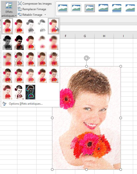 Sans quitter Excel, vous pouvez appliquer des effets artistiques à vos images en seulement quelques clics souris :