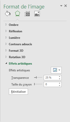 Pour aller plus loin avec cette fonctionnalité, cliquez sur l'icône Effets artistiques du groupe Ajuster puis sur Options Effets artistiques. Cette action provoque l'affichage du volet Format de l’image, dans lequel vous pouvez ajuster plusieurs paramètres en rapport avec l'effet sélectionné.