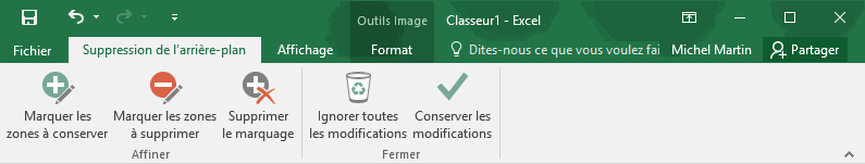 Cliquez sur l’image dont vous voulez supprimer l’arrière-plan, puis sélectionnez l’onglet Outils Image/Format dans le ruban. Cliquez sur Supprimer l’arrière-plan dans le groupe Ajuster. Ce qu’Excel considère comme étant l’arrière-plan apparait immédiatement en mauve dans l’image.