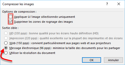 Cette action déclenche l’affichage de la boîte de dialogue Compresser les images. Il vous suffit maintenant de sélectionner une des options proposées sous Sortie cible puis de valider en cliquant sur OK.