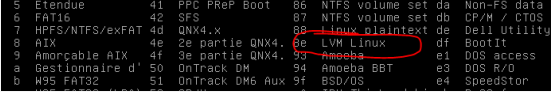 Le type de partition LVM, utilisée par les tables de partitionnement GNU/Linux est identifiée par l’indicateur 0x8e de la commande fdisk.