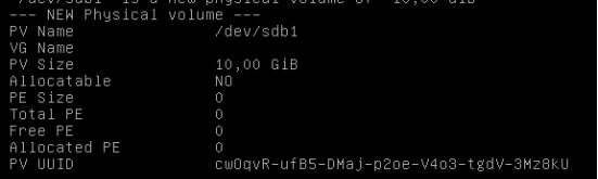 Cela permet d’initialiser une nouvelle partition sur le disque /dev/sdb. Il est important de disposer d’au moins une partition valide, au bon format (LVM), pour pouvoir en faire un volume physique au sein d’une structure LVM :