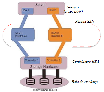 Mais, généralement, par mesure de sécurité, les volumes des baies de stockage sont accessibles par différents chemins pilotés par les contrôleurs HBA (Host Bus Adapter). Ce mécanise de sécurisation des accès au LUN, s’appelle le multipath, il permet, en cas de panne de pouvoir toujours accéder aux données hébergées sur la LUN :