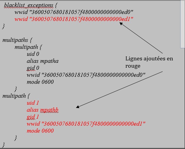 Exemple : pour une LUN ayant l’identifiant wwid "3600507680181057f4800000000000ed1" on devra déclarer dans le fichier multipath.conf les lignes suivantes :