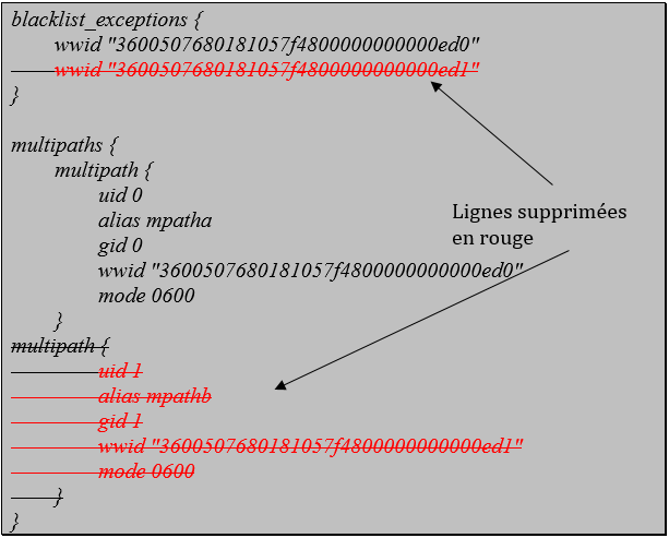 Pour finir, il faut aussi modifier le fichier /etc/multipath.conf et supprimer les occurrences de la LUN que l’on souhaite enlever :