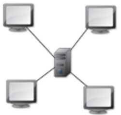Ce genre d’architecture est également appelé hub & spoke. C’est la topologie la plus courante. Elle permet une gestion et un dépannage très facile. La panne d’un nœud ne perturbe absolument par le réseau global. En revanche, le concentrateur (aussi appelé hub ou plus fréquemment appelé commutateur), qui relie tous les nœuds entre eux, constitue un point unique de défaillance. Une panne de cet équipement rend le réseau totalement inutilisable. Le réseau Ethernet est un très bon exemple de réseau en étoile. Il faut toujours veiller, par contre à la longueur des câbles utilisés.