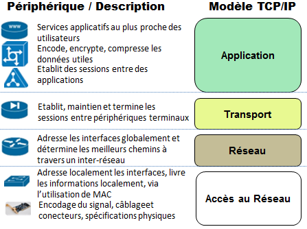 En termes d’actions aux périphériques et aux applications, chaque couche apporte son lot de services permettant de traiter les différents problèmes sous-jacents :