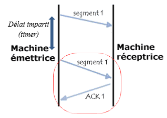Après quoi, grâce à une minuterie déclenchée dès la réception d’un segment, au niveau de l’émetteur, le segment est réexpédié dès lors que le délai imparti est écoulé. En effet, dans ce cas, le protocole considère que le segment est perdu :