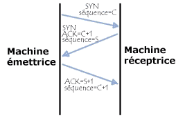 Donc, les deux machines en communication doivent synchroniser leurs séquences. Cela se fait par le mécanisme appelé "three way handshake" (traduit en poignée de main à trois temps – c’est le protocole que l’on a communément, nous humain, l’habitude d’utiliser pour se dire "bonjour").