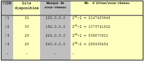 Pour information voici, les quatre premières lignes du tableau de correspondance CIDR d’attribution des adresses :