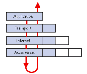 Ainsi, lors d’une transmission, les données traversent chaque couche du modèle TCP/IP de la machine émettrice et à chacune d’elles, une nouvelle information, appelée entête, est ajoutée au paquet de données. Il s’agit d’un ensemble de d’informations garantissant la transmission. Au niveau de la machine réceptrice, l’information transite alors par chacune des couches du modèle, l’entête est lue, puis supprimée. Ainsi, à la réception, le message se présente dans son état originel :