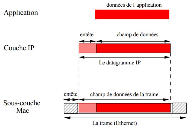 Afin de tenir compte des transformations et de la fragmentation, chaque datagramme se voit ajouté plusieurs champs, permettant de procéder au ré-assemblage ultérieur. Ce mécanisme, appelé l’encapsulation, permet de fournir les informations liées à chaque couche de passage du datagramme et de pouvoir faire en sorte d’acheminer correctement l’information vers son destinataire.
