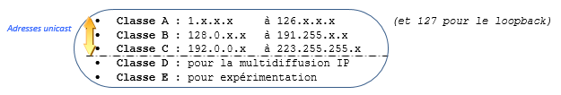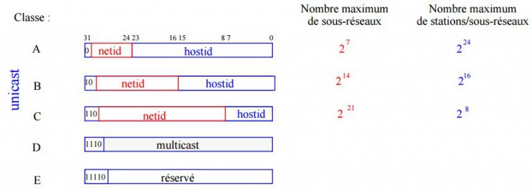 Suivant les cas de figure, il existe quatre ou cinq classes d’adresses, notifiée par les lettres A à E :