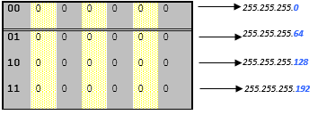 Étape 4 : on peut alors convertir ce masque en décimal, soit 255.255.255.192 et calculer l’ensemble des sous-réseaux possible (en faisant varier les "y" derniers bits du masque correspondant alors à la partie machine soit, d’après l’exemple :