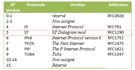 REMARQUE : c’est l’IANA (Internet Assigned Numbers Authority), un organisme d’autorité et de régulation de l’Internet, qui attribue un nombre (parmi les 24 valeurs possibles), pour chaque nouvelle version de protocole d’interconnexion. Si l’on consulte le tableau des versions actuelles on découvre ceci :