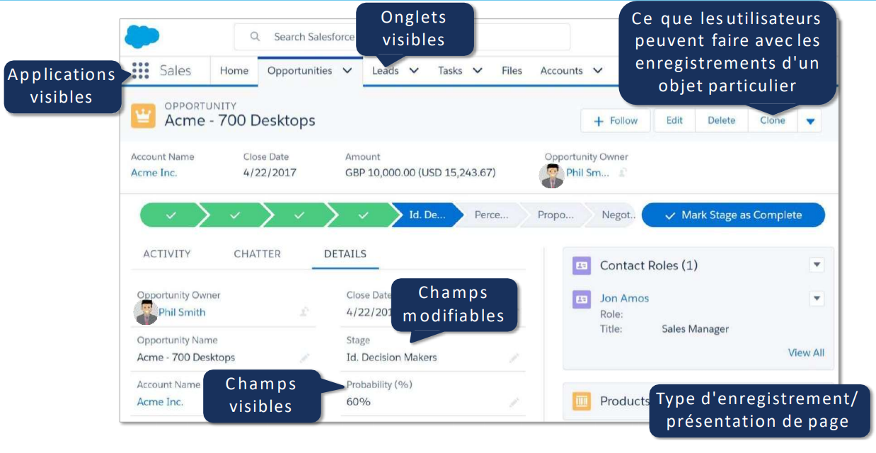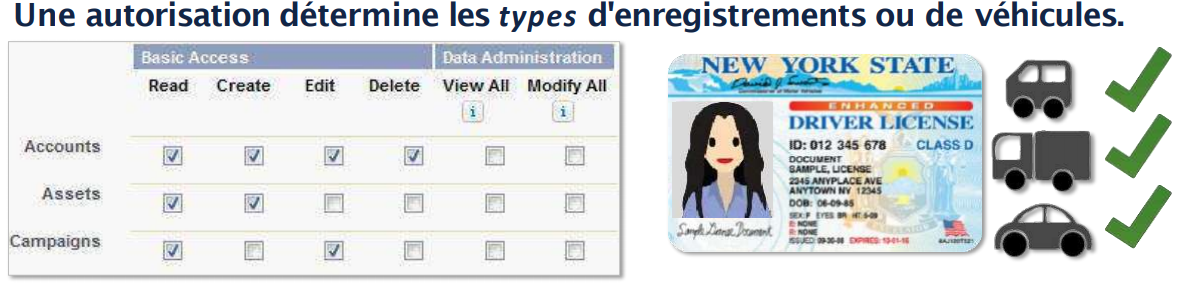 Les autorisations d'objet déterminent le type d'enregistrement (objet) que les utilisateurs peuvent afficher, créer, modifier ou supprimer, mais pas les enregistrements individuels eux-mêmes. Comparez-les à des autorisations liées au véhicule sur un permis de conduire :