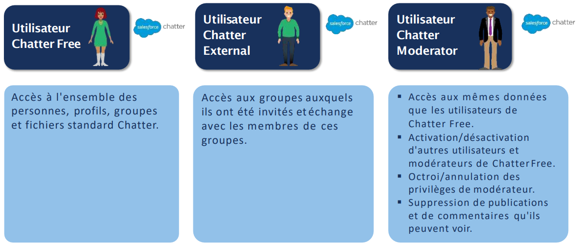 Les profils Chatter sont exclusivement réservés aux utilisateurs bénéficiant d'une licence utilisateur Chatter Free ou Chatter External et permettent aux utilisateurs de se connecter à Chatter uniquement.