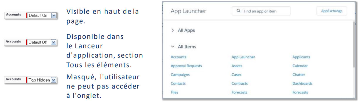 Les paramètres d'onglet vous permettent de définir la visibilité de référence de l'onglet pour les utilisateurs associés au profil.
