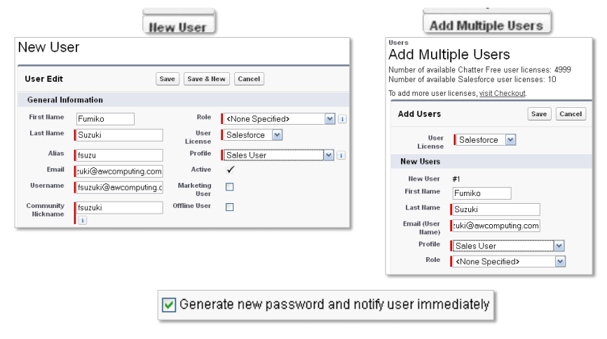 Vous pouvez créer des utilisateurs uniques ou multiples à l'aide des informations requises. L'option Générer un nouveau mot de passe, sélectionnée par défaut, enverra à l'utilisateur par e-mail le nom d'utilisateur et un mot de passe provisoire.