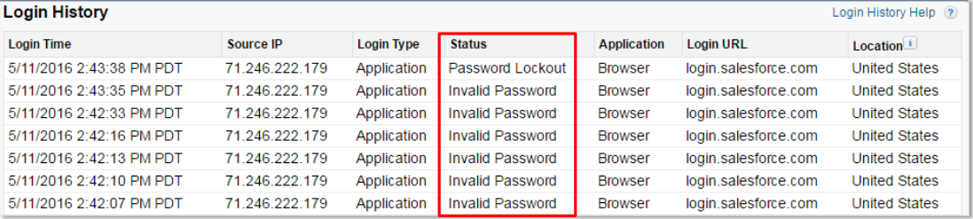 La liste relative à l'historique de connexion dans un enregistrement utilisateur affiche quand, où et comment un utilisateur tente de se connecter. Utilisez la colonne Statut pour diagnostiquer les problèmes de connexion. S'il n'existe aucune entrée ici portant sur la tentative de connexion de l'utilisateur, ce dernier utilise probablement un mauvais nom d'utilisateur.