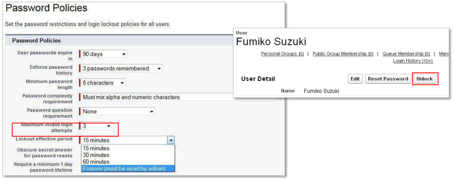 Un verrouillage du mot de passe se produit quand votre politique en matière de mots de passe verrouille les utilisateurs qui excèdent un certain nombre de tentatives de connexion. Ce verrouillage peut être temporaire ou nécessiter une réinitialisation de l'administrateur. Vous pouvez déverrouiller un utilisateur en cliquant sur Déverrouiller dans l'enregistrement de l'utilisateur en question.