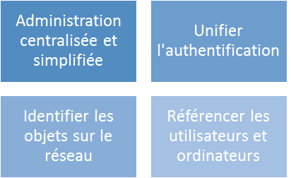 - Administration centralisée et simplifiée : la gestion des objets, notamment des comptes utilisateurs et ordinateurs est simplifiée, car tout est centralisé dans l’annuaire Active Directory. De plus, on peut s’appuyer sur cet annuaire pour de nombreuses tâches annexes comme le déploiement de stratégies de groupe sur ces objets .