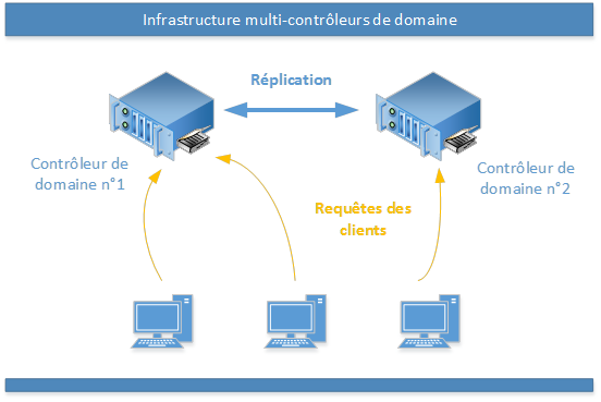 Sur le schéma ci-dessous, on trouve deux contrôleurs de domaine, présent au sein d’un même domaine et qui réplique entre eux des informations. Des postes de travail client sont également présents et intégrés dans ce domaine, ils contactent les contrôleurs de domaine pour effectuer différentes actions (authentification d’un utilisateur, demande d’accès à une ressource...).
