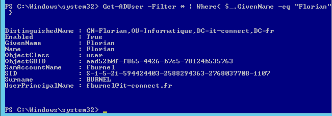 Pour illustrer mes propos, voici une sortie PowerShell qui affiche quelques attributs et leurs valeurs, concernant l’utilisateur « Florian » :