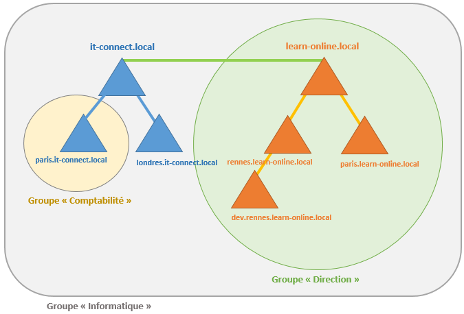 Reprenons l’arborescence que nous avions définie dans le module « Domaine, forêt et arbre », avec les deux domaines « it-connect.local » et « learn-online.local » contenant tous les deux des sous-domaines.