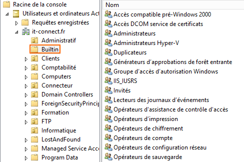 Ce sont des groupes qui permettent d’assigner des autorisations d’administration, de façon générale ou sur des fonctionnalités précises afin de gérer la sécurité finement. Ces groupes sont directement intégrés et stockés dans l’annuaire Active Directory au sein du container « Builtin » accessible de la console « Utilisateurs et ordinateurs Active Directory ». Leur étendue est toujours de type local.